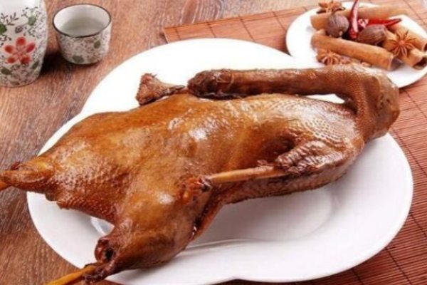 (3)鹵鵝 用五香鹽抹勻鵝身內(nèi)外,并用竹筷一段橫撐在腹腔內(nèi),腌制10min,待鹵水燒開,放入光鵝燒沸后,改用中火。在鹵制過程要將鹵鵝吊起,離湯后,再放下。反復三次。鹵制時間要看光鵝的老、嫩程度而定,大約煮1.5h左右。并注意把鵝身翻轉數(shù)次,使其入味。然后撈起,吊掛起來,待涼。