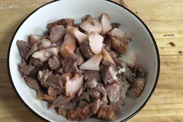 1、準備食料:豬頭肉半斤,這是熟食店買好的豬頭肉,豬嘴巴最好吃 肥瘦相間,豬頭肉切片