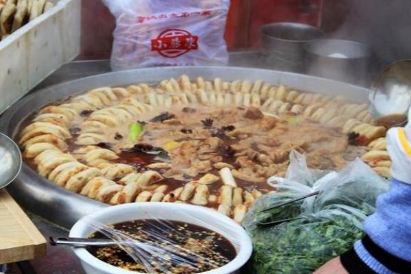具體制作過(guò)程是這樣的:把處理好的豬小腸和豬肺切成小段投入用多種香料、調(diào)料配制的鹵湯煮,八成熟的時(shí)放入生面火燒、炸豆腐片、血豆腐,待到腸、肺爛熟,火燒煮透又不脫形的時(shí)候撈出,小腸切段,肺、火燒、炸豆腐切塊,澆鹵汁,加蒜汁、醬豆腐汁、香菜,醋、辣椒油根據(jù)口味自行添加。