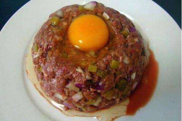 韃靼牛肉是法國的一個特色菜,其實不止在法國,就連捷克、匈牙利等國家的餐桌上也常見此菜的蹤影。且慢說它是黑暗料理,這種小牛肉被貼刀細細切出丁來以后,需要放上茴香籽、辣醬油、鹽,黑胡椒、洋蔥、檸檬汁等調料拌好,而這個過程,就相當于一個輕腌制過程,還起到了一定的消毒作用,馬馬虎虎可以算是一成熟了。并且做韃靼牛肉選料要求精細,基本都只要那一部分的瘦肉,切法也講究,不會出現血呼啦的成品,所以只要克服一定的心理障礙,吃起來據說還是挺鮮嫩的,一不小心可能會愛上,嘗試需慎重。