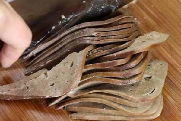 5、20分鐘過后,先用筷子戳一下豬肝,看看里面有沒有熟透,然后再撈出來晾涼,涼了之后,把豬肝切成厚度差不多的薄片。