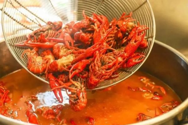 香料、干辣椒等放好之后,接下來就是將精鹽、炒制好的糖色放入鹵鍋中,以小火慢熬,保持鹵汁沸而不騰的狀態,時間約為4小時左右,然后將處理好的龍蝦(這里小龍蝦每鍋鹵制控制在3千克左右即可,以保證小龍蝦成品的口感,如果撈出后不能馬上銷售出去,可將其放入鹵油中浸泡,到銷售時再撈出。)放進去鹵制,熟透后撈出,瀝干凈油,裝盤即可。