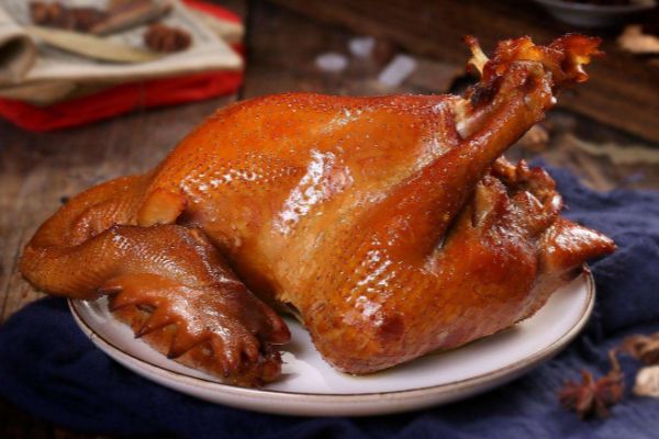 3.第二天,先把雞連同鹵湯一起上火燒開,撈出來后趁熱送入掛爐烤箱,另外放入白糖和茶葉,燃小火熏1分半鐘,取出來給雞身刷上鹵湯油便好。