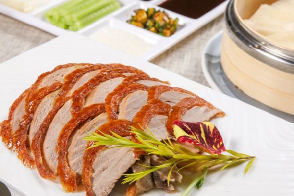 按1.5千克的光鴨計算,先打氣,然后用精鹽45克、味精15克、糖15克、黃酒12克、姜5克、香料水500克(由花椒3克、桂皮2克、丁香1克、茴香3克、白芷1克、胡椒3克、木香1克、陳皮2克、肉蔻2克、甘草1克、老姜片8克,用550克沸水浸泡30分鐘),其間要用香料水灌入肚中反復3次,腌24小時,上鉤,燙皮,風干,入爐烤制,食時用刀片下肉、跟甜面醬、荷葉餅。鴨架可做湯。