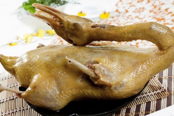 選用當(dāng)年健康肥鴨,宰殺拔毛后,切去翅膀的第二關(guān)節(jié)和腳爪,在右翅下開口,取出全部內(nèi)臟,用清水沖凈胴體內(nèi)外,放入冷水中浸泡1小時(shí)左右,取出后在濃度為10%的食品級磷酸三鈉(TSP)溶液中浸泡半分鐘,晾掛1-2小時(shí)待用。
