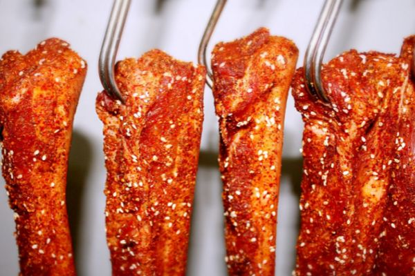 腌制料:花椒粉250克、孜然粉250克、十三香20克、雞精300克、味精250克、鹽700克、特辣辣椒面500克,將料混合攪拌均勻,涂抹在五花肉上(掛鉤子的地方,肉的上端必須涂抹調料),白色熟芝麻適量撒勻,最后滴入調料油,直至全部攪拌均勻(確保每條肉都被調料浸透),隨即靜置腌制6--8小時,即可。