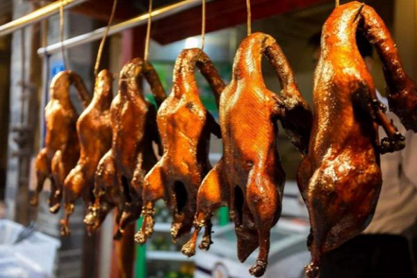 制作過程:將其用糖水上色后風干一夜,第二天拿出來放入木炭烤箱(也可以采用煤氣烤箱),然后觀其色,因為木炭的質量可能因為不同,所以時間不好確定,使用木炭烤制可以讓烤鴨烤制出來還帶有果木香味,而且皮質脆嫩,色澤漂亮。