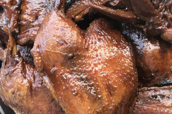 ②、烤制: 把腌制好的鴨子再清洗 2 遍,用干凈的抹布抹干,均勻刷上老抽上色,掛進烤爐里烤 2 個小時左右,根據整鴨的老嫩來決定時間或者根據當地的口味來調整,烤成金黃色即可, 期間 每半小時檢查一次,火候要控制好,不能用太大的火,顏色淺了再刷一次老抽上色, 直到顏 色滿意為止。