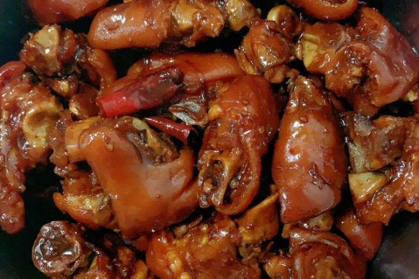 4)鍋內放入色拉油200克;燒至三成熱時放入干辣椒節、花椒小火煸炒至干辣椒節變為金黃色;放清水1千克調勻,出鍋備用。(5)另取不銹鋼桶內用竹墊子,放入豬蹄、糖色、蠔油、花雕酒、鹽、雞精、老抽、煮好的辣椒節和花椒、熬好的湯、生姜、大蔥蓋上蓋子大火燒開,改小火鹵1小時,離火即可。特點:口味香辣,肉質軟爛。