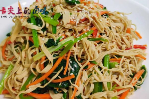 制作方法:取鍋上火,放入750克清水燒開,放入水發(fā)成品豆皮絲,放入5克鹽,中火煮約5分鐘,撈出放入涼水沖洗至涼,瀝干水,放入拌菜盆,加入鹵水50克、精鹽5克、花椒油10克、香醋5克、生抽5克、味精4克、辣椒油15克、熟白芝麻10克、蒜蓉10克、香菜10克,充分拌勻即可;